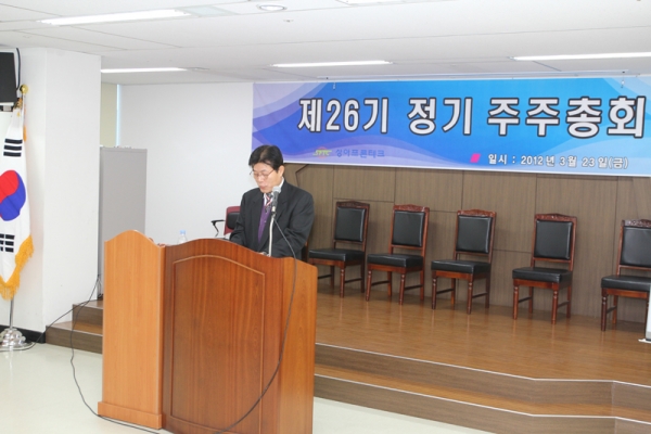 주주님의 건승과 댁내의 평안을 기원합니다. 상법 제363조와 당사 정관 제18조에 의거 정기주주총회를 아래와 같이 개최하였습니다. - 아 래 - 1. 일 시 : 2012년 03월 23일 (금요일) 오전 10시 00분 2. 장 소 : 인천광역시 남동구 남동대로 215번길 30(고잔동 636) 인천종합비즈니스 센터 5층 세미나실 3. 회의 목적 사항 가. 보고안건 ① 감사보고 ② 영업보고 ③ 감사인 선임보고 나. 부의안건 제 1 호 의안 : 제26기(2011.01.01~2011.12.31) 재무상태표, 손익계산서 및 이익잉 여금처분계산서(안) 승인의 건 제 2 호 의안 : 사내이사 선임의 건 제 3 호 의안 : 사외이사 선임의 건 제 4 호 의안 : 이사 보수한도 승인의 건 제 5 호 의안 : 감사 보수한도 승인의 건 끝.