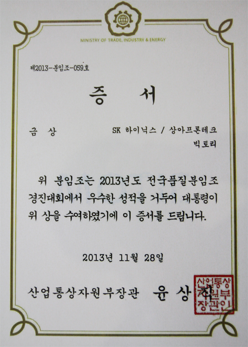 2013년 전국 품질분임조대회에서 SK하이닉스와 함께 '빅토리' 분임조로 참가하여