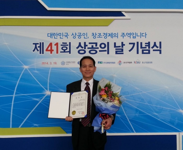 2014년 3월 19일(수), 당사의 이우형 상무이사는 삼성동 코엑스에서 열린 '제41회 상공의 날' 기념식에서 국내 상공업 발전에 기여한 공로로 모범관리자 부문 '산업통상자원부 장관 표창'을 수상하였습니다. 한편, 이날 행사에서는 정홍원 국무총리 및 박용만 대한상공회의소 회장 등이 참석한 가운데 271명의 상공인이 훈장과 산업포장 및 대통령표창을 수여받았습니다. |