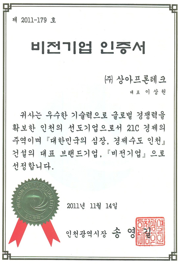 당사는 2011년 11월 14일 인천광역시에서 주관하는.. 미래의 신성장동력 창출을 위하여 기술력과 성장잠재력이 뛰어난 강한 인천의 선도기업인 "비전기업"에 선정되었습니다. ※비전기업 지원시책 1. 자금 및 보증 확대 - 경영안전자금 확대 및 이자 지원 (인천시에서 대출자금의 은행금리 3% 이자지원) - 신용보증재단, 신용보증기금, 기술보증기금을 통한 보증공급 확대 2. 기술/품질/지식재산 우선지원 - 비전기업의 국내외 규격인증, 디자인, 시제품개발, 지식재산권, 산학관 기술지원 협력체계 강화등 3. 수출 및 마케팅 우선지원 - 수출자금 및 시장개척 등 수출인프라 지원 4. 중소기업 지원기관 연계 필요분야 맞춤형 지원
