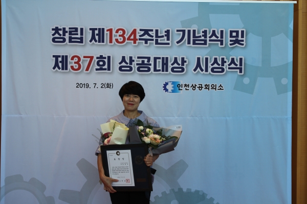 2019년 7월 2일(화) 송도 컨벤시아에서 인천상공회의소 주관으로 진행된 제37기 상공대상 시상식에서 당사의 정혜경 과장(OA-영업팀)이 장기근속 모범근로자로 선정되어 "인천광역시장상"을 수상하였습니다. 평소 투철한 사명감과 책임감으로 맡은바 업무를 성실히 수행함은 물론 장기근속을 통하여 회사발전과 지역경제 발전에 이바지한 공이 크므로 장기근속 모범근로자에 선정되어 수상을 하였습니다. |