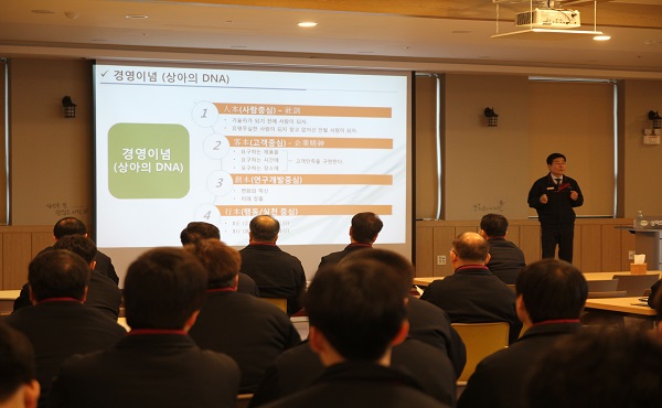 당사는 2020년 1월 10일(금), 본사 강당에서 전 임직원을 대상으로 '2020년 경영방침 설명회'를 개최하였습니다. 이번 설명회에서는 2019년 사업부별 실적 및 2020년 경영방침과 경영목표, 경영이념 및 사명 등에 관하여 이상원 사장님께서 직접 진행하였습니다. 2020년은 '기본충실','변화혁신','미래창출'을 세부경영방침으로 정하고 人本(사람중심),客本(고객중심),創本(연구개발중심),行本(행동/실천 중심)에 관한 경영이념을 강조하였으며, 창업 50주년을 맞이하는 VISION 2024를 제시하며 글로벌 첨단부품/소재 전문기업으로 거듭날 수 있도록 임직원들의 노력을 당부하였습니다. 2020년 경자년(庚子年)에는 더욱 어려운 경제환경이 전망되는만큼 당사의 임직원들은 실천 의지를 더욱 확고히하여 회사의 경영목표 달성을 위한 최선의 노력을 다하겠습니다.