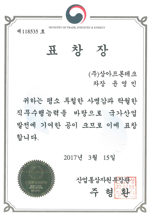 인정되어 당사의 윤영민 차장(회계팀)이 “산업통상자원부 장관상”을 수상하였습니다.
