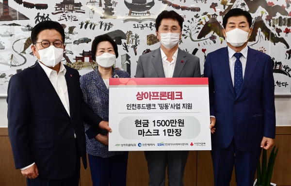 당사는 지난 6월 10일(목), 인천시 푸드마켓 사업 활성화를 위해 현금 1,500만원과 마스크 1만장 (500만원 상당) 등 총 2,000만원의 기부금품을 인천사회복지공동모금회에 전달하였습니다. 이날 전달식에는 이상원 상아프론테크 대표이사, 조택상 인천시 균형발전정무부시장, 조상범 인천사회복지공동모금회장 및 이명숙 인천사회복지협의회장이 참석했습니다. 인천시는 올해부터 푸드마켓 이용자의 편의 증대를 위해 푸드마켓 물품을 집까지 직접 배달해주는 서비스 "띵동 푸드마켓"을 실시해 코로나19 감염병을 예방하고 수요자 중심의 편리한 서비스를 제공하고 있으며, 당사의 기부금과 물품은 인천시 푸드뱅크 배달서비스 "띵동푸드마켓"등을 통해 관내 취약계층과 사회복지 시설에 지원될 예정입니다. 당사는 앞으로도 지속적인 나눔 활동을 통해 인천시의 도움이 될 수 있도록 적극 노력하겠습니다. |