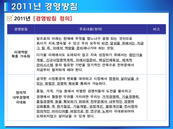 경영방침 추진실적과 2011년 경영방침/경영목표 설명회를 개최하였습니다.