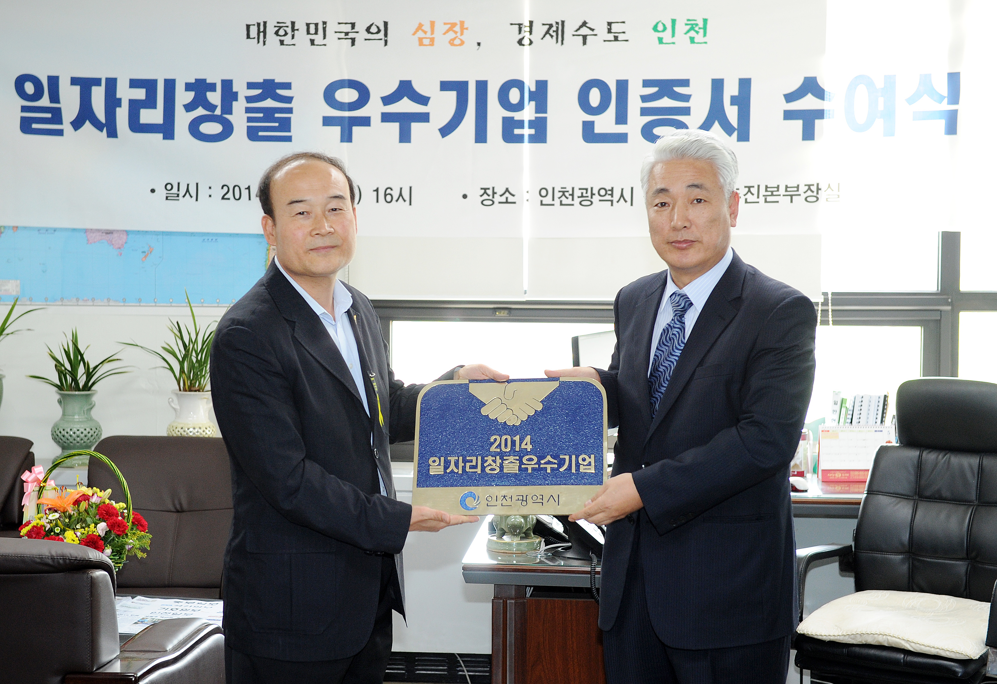 2014년 5월 15일(목), 당사는 인천시로부터 양질의 일자리를 창출하고 고용을 유지하여 지역고용 안정 및 분위기 확산에 기여한 공로로 '2014년도 일자리 창출 우수기업'에 선정되었습니다. 이번 수상은 최근 1년간 직원 10명 이상을 신규로 채용했거나, 근로자 증가율이 5% 이상인 기업을 대상으로 선정하였으며, 당사는 청년 인턴 우선 배정 및 경영자금 우대지원 등 다양한 혜택을 받게 되었습니다. 앞으로도 당사는 인천시의 취업률 제고에 큰 디딤돌 역할을 하도록 최선의 노력을 다하겠습니다.