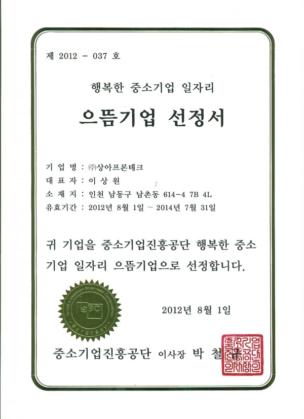 행복한 중소기업 일자리 " 으뜸기업 "에 선정되었습니다.