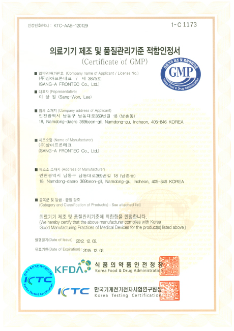 GMP(의료기기 제조 및 품질관리기준 적합인증서)를 취득하였음을 알려드립니다.