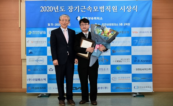 2020년 7월 2일(목) 인천상공회의소에서 진행된 2020년도 장기근속모범직원 시상식에서 당사의 김지태 수석기사(기술팀)가 "장기근속 모범근로자 인천광역시의회 의장상"을 수상하였습니다. 평소 투철한 사명감과 책임감으로 맡은 바 업무를 성실히 수행함은 물론 장기근속을 통하여 회사발전과 지역경제 발전에 이바지 한 공이 크므로 장기근속 모범근로자에 선정되어 수상을 하였습니다. |