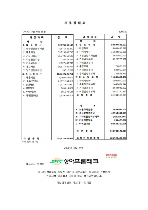 (주)상아프론테크 제34기 결산공고