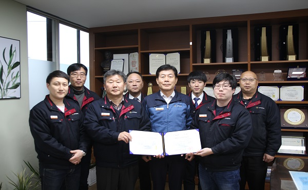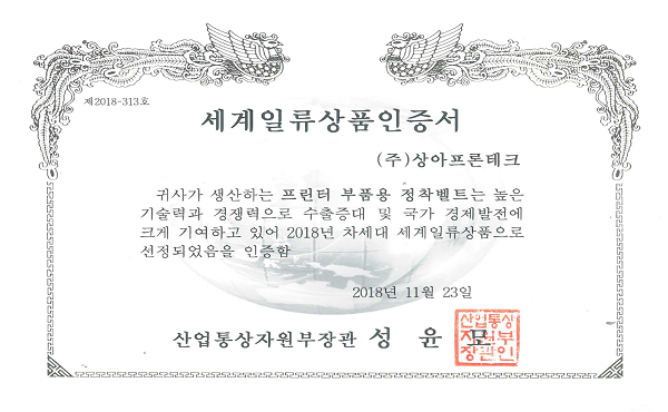 2018년 11월 23일(금), 산업통상자원부가 주최하고 코트라(KOTRA)가 주관하는 '2018년 세계일류상품'에 당사가 생산하고 있는 '정착벨트'가 LCD CASSETTE, 전사벨트에 이어 세 번째로 선정되었습니다. 세계일류상품은 '현재일류상품'과 '차세대일류상품'으로 나누어지며, '정착벨트'는 7년 이내에 세계시장점유율 5위 이내에 들어갈 가능성이 있는 상품으로 '차세대일류상품'에 선정되었습니다. '정착벨트'는 레이저 프린터, 복합기, 복사기 등에서 용지에 달라붙은 토너를 고온/고압으로 융착시키는 역할을 하며, 당사는 토너와의 이형성을 좋게 하기 위해서 박막의 불소수지를 코팅하는 핵심기술을 보유하고 있습니다. |