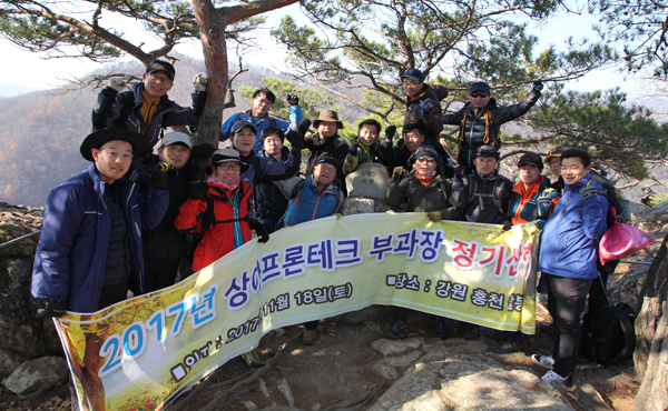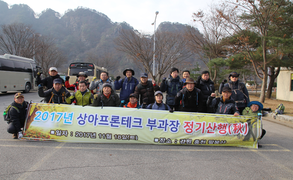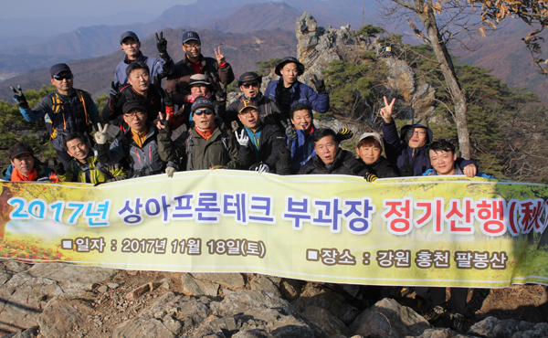 당사는 2017년 11월 18일(토) 강원도 홍천에 있는 우리나라의 100대 명산중 하나인 팔봉산에서 2017년 2차 부과장 등반대회를 실시하였습니다. 이번 등반대회는 임원, 부과장 직급을 대상으로 팔봉산 입구를 시작으로 1봉에서 8봉까지 팔봉산의 모든 정상을 등반하였으며 저물어가는 가을의 경치와 시원하게 흐르고 있는 홍천강을 둘러보았으며 참가자 전원이 무사히 산행을 마무리 하였습니다. 부과장 등반대회는 (주)상아프론테크 핵심역량 직급인 부과장협의회의 주관으로 단합과 심신단력을 위하여 매년 실시하고 있습니다. |