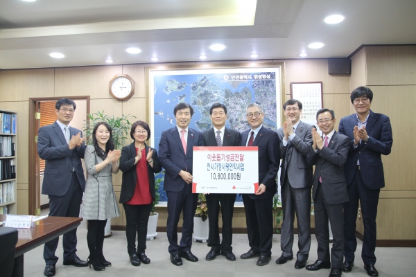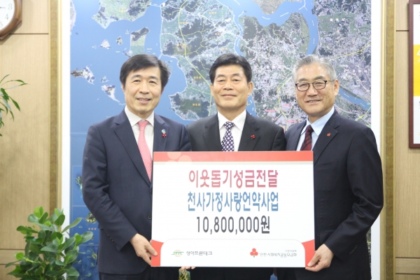 이날의 성금은 당사가 인천형 공감복지 사업인 "천사(1004)가정 사랑언약사업"의 취지에 공감하여 동참하게 되었으며, 저소득 취약계층 30가정에게 1년 동안 매월 3만원씩 지원됩니다.